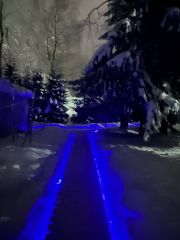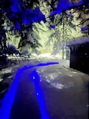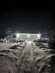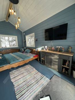 - Беседка в восточном стиле — с узбекским топчаном 3 на 3 метра с курпачи и подушками, оборудована большим телевизором и умной колонкой, находится в лесной части участка.