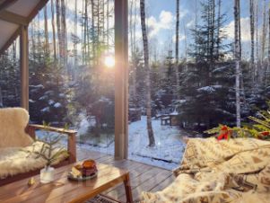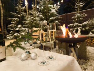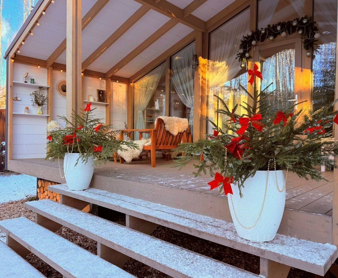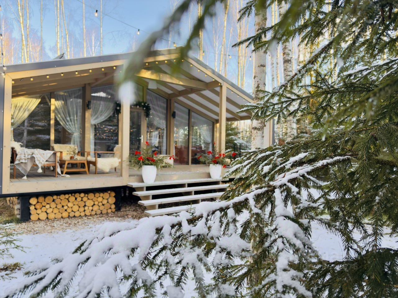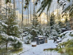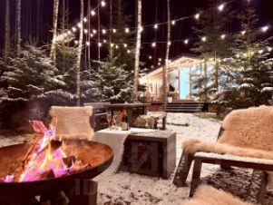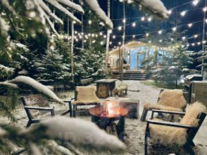 Самый красивый костровой зал с комфортными креслами среди елок и берез под теплым атмосферным светом гирлянд.