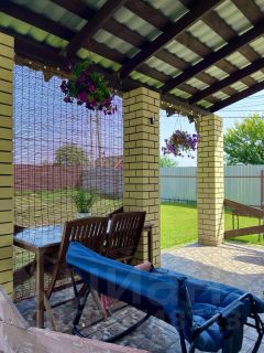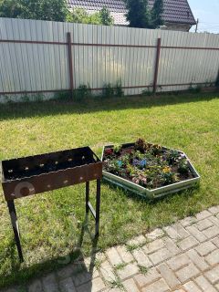 Перед домом большая парковочная площадка для 2-3 машин, навес на 2 машины. Озеленение на участке: газон, туи, сирень, молодая яблоня. Позади дома на улице безопасная детская площадка с качелями, горкой, лазилками. Из кухни-гостиной можно присматривать за детьми на улице, выход на улицу прямо из гостиной через террасу. Имеются металлические уличные качели, мангал-барбекю.