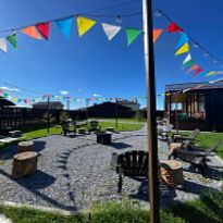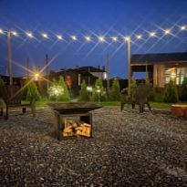Эстетичная костровая зона с дизайнерской подсветкой, столиками и креслами.