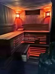Второй двухэтажный дом 120 м2, это русская баня на дровах. парилка на 6-7 чел, душевая комната, санузел, небольшая кухня, есть музыка и TV, бассейн с подогревом воды 6х3 . На 2 этаже тренажерный зал с силовым комплексом, тренажерами и массажным креслом, комнаты отдыха с диванами, спальня.