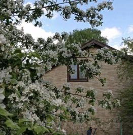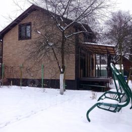Ухоженный участок с газоном и дорожками, вокруг цветы, кустарники, плодовые деревья. Для досуга есть мангал, большие садовые качели, детская песочница.
