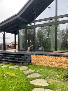 Главная особенность дома — панорамная стеклянная стена, выходящая на живописный овраг. Из дома открывается красивый вид на зелень и природный ландшафт, создающий ощущение уединения и тишины.