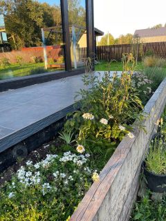 Перед центральной террасой сделана высокая декоративная клумба с многолетними цветами.