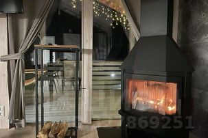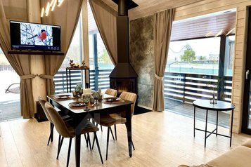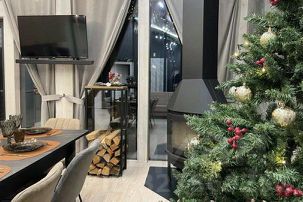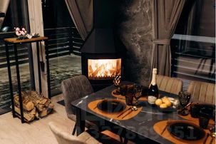 - просторная кухня-гостиная с дровяным камином, раскладным диваном и современным ТВ с подпиской Яндекс Plus