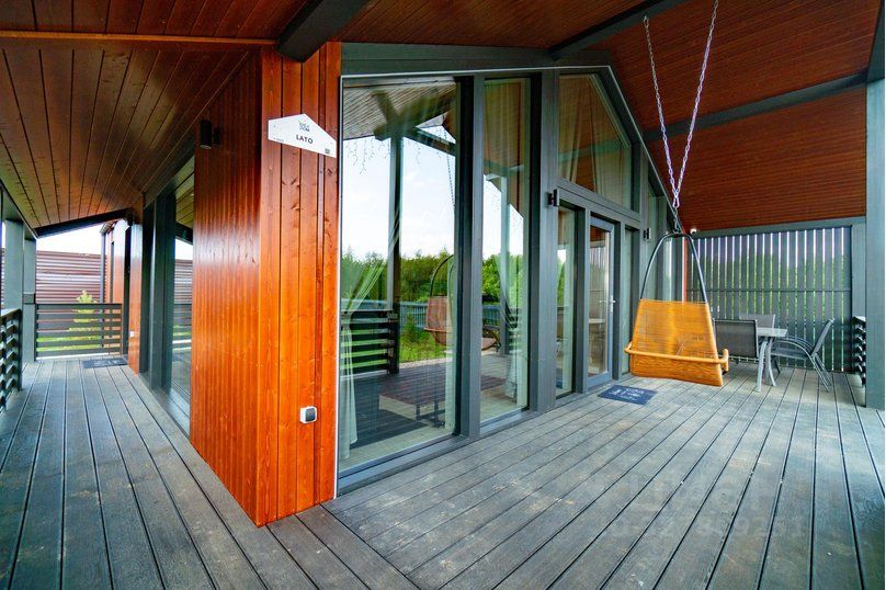 - на крытой террасе - уютная зона для отдыха со столиком, стульями и подвесным креслом.