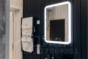 - санузел с теплым полом, душевой кабиной, унитазом, раковиной, феном и зеркалом с подсветкой