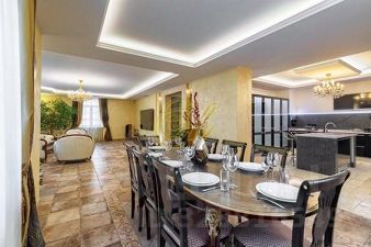 В доме 5 спальных комнат с размещением на ночь до 18 человек, 4 санузла. На банкет до 25 человек.