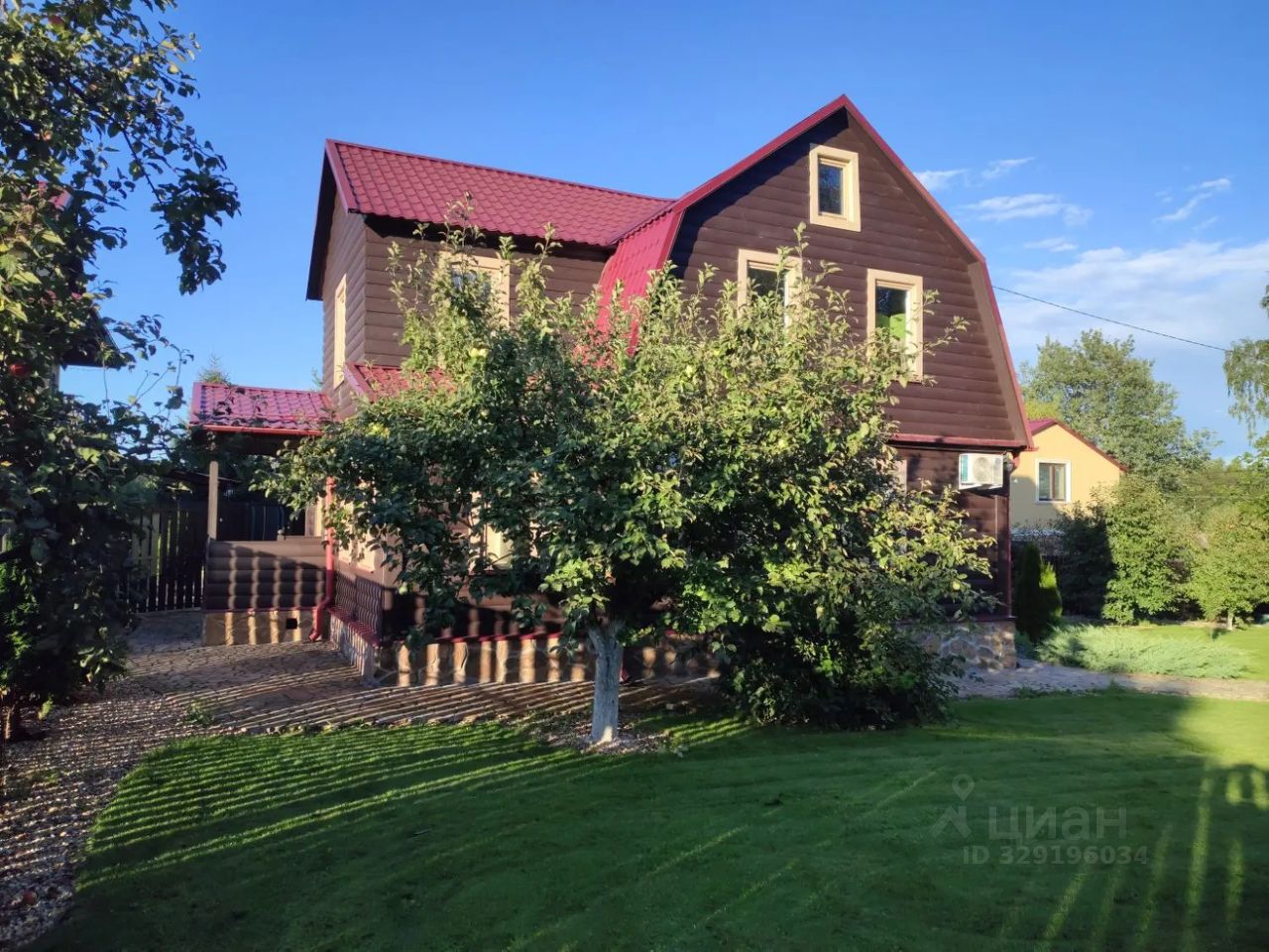 На участке хвойные и садовые плодовые деревья, кустарники, газон, дорожки, гостевая парковка.