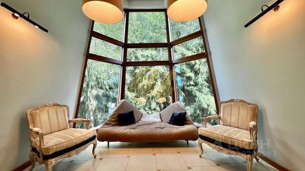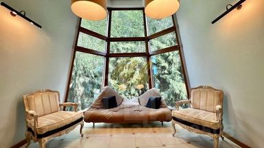 Просторный холл с панорамным видом на лес (раскладной диван).