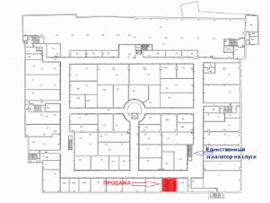 Помещение находится рядом с единственным эскалатором на спуск со 2го этажа. Помещение прямоугольной формы, с построенным внутри небольшим кабинетом (стены кабинета можно снести).