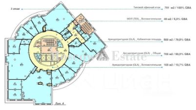 Планировка: смешанная (open space, кабинеты, переговорные, VIP-офисы с апартаментами, площадь типового этажа 750 м2 (делится на 2 крыла по 375 м2 с круговым коридором на этаже). Типовой ремонт.