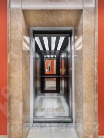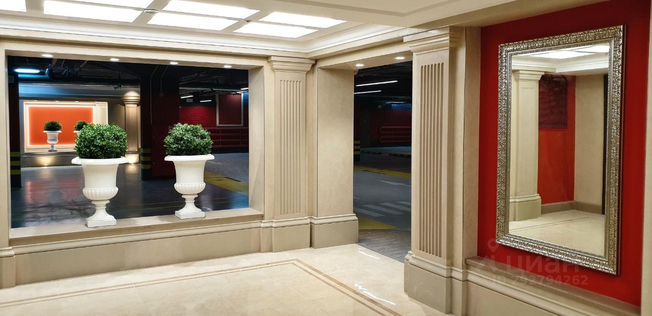 В лифтовом холле подземного паркинга премиальная отделка натуральным мрамором выполнена в едином стиле с лобби и общественными пространствами комплекса в целом, а стильные вазоны с растениями и репродукции картин привносят в пространство нотки домашнего уюта.