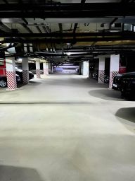 Машиноместо размером 5,4 м на 2,4 м. Слева от места водителя - капитальная стена. Справа ограничено столбом и двойной разметкой.