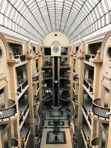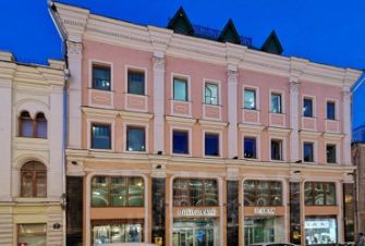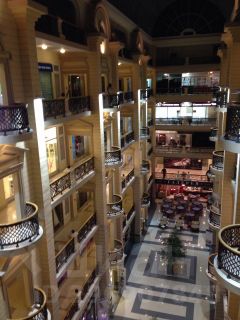 В здании также установлены 4 эскалатора фирмы Шиндлер . По периметру атриума на балконах, связанных общими галерейными коридорами, располагаются бутики (включая и 5 этаж). В здании расположены бутики мужской одежды, ювелирных изделий, студии красоты, туристические фирмы, всего более 50 магазинчиков.