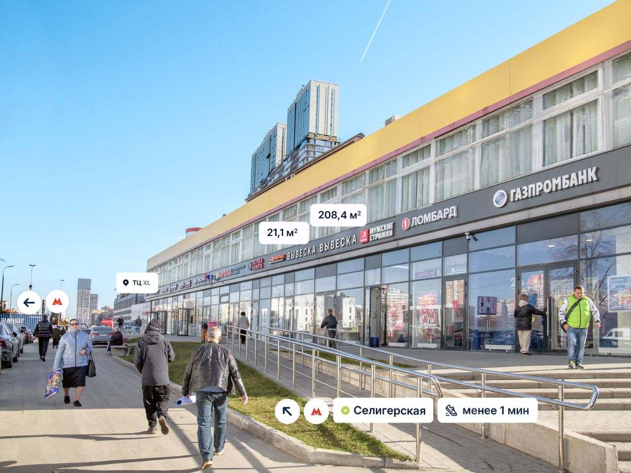 Oтдeльный вход c первой линии, есть вход с торца. Meстo для pазмещeния вывeски. Большой жилой массив. В окружении расположены: бизнес-центр РТС, торгово-развлекательный центр XL, крупные жилые комплексы Селигер Сити, Дуэт, Ильменский 17, апарт-комплекс ApartVille Fitness&Spa Resort и др.