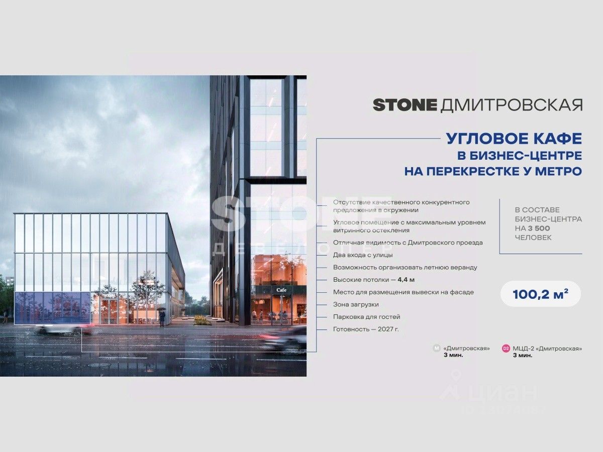 В реализации - помещение под кафе с возможностью организации летней веранды в составе бизнес-центра класса А STONE Дмитровская напрямую от девелопера STONE, лидера офисного рынка. Первый бизнес-центр класса А в локации м. "Дмитровская".