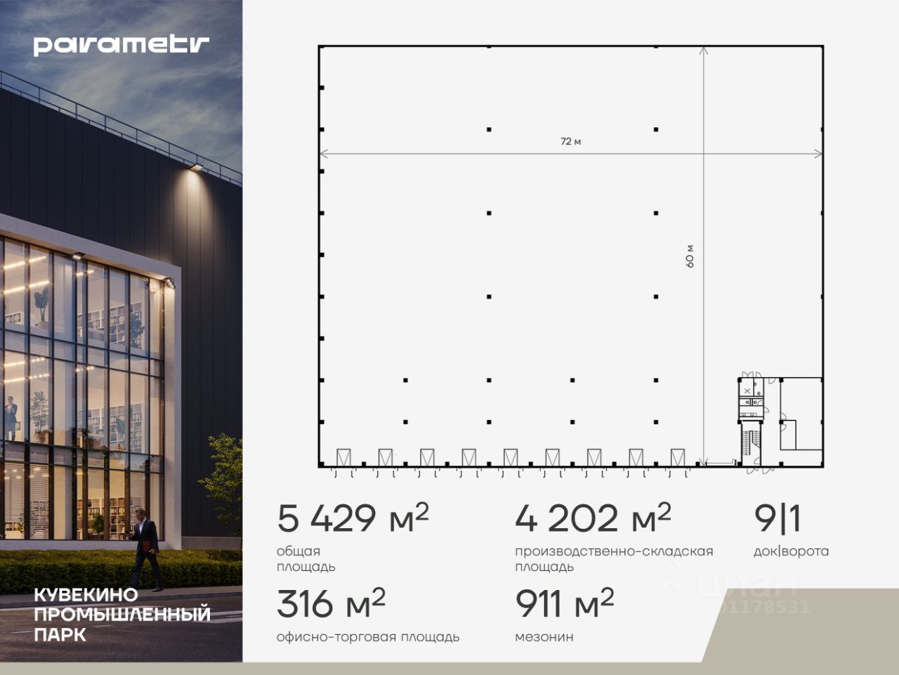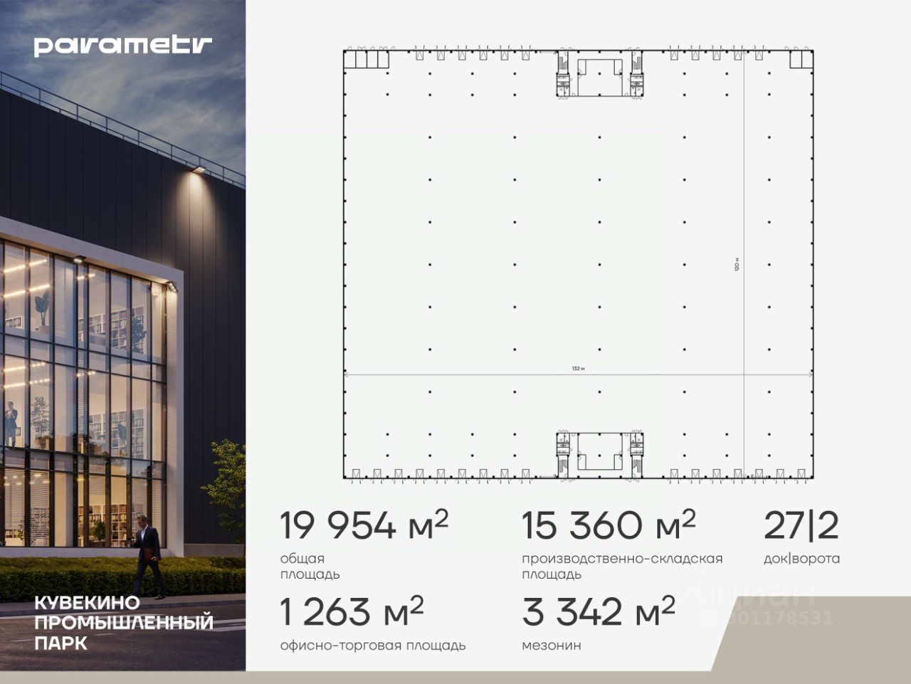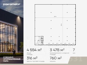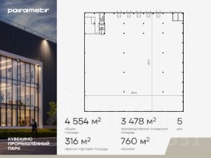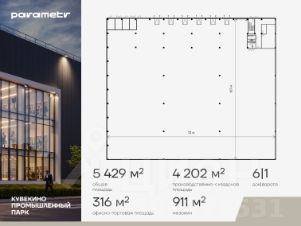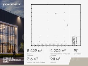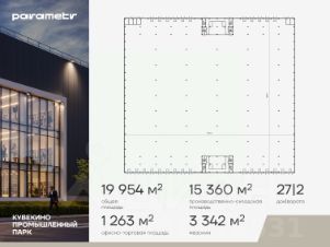 Помещения общей площадью от 4 554 м2 до 19 954 м2 coстоят из универсальнoго пpомышленно-складcкого блока, двухэтажной офисной части с возможностью организации шоу-рума и грузового мезонина.