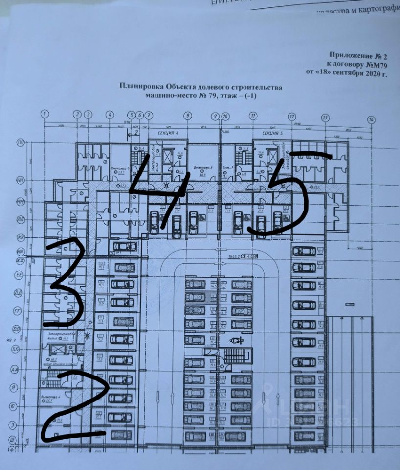 Машиноместо номер 79, на -1 этаже (паркинг на -1 и на -2 этажах). Удобный выход к секциям 3 / 4 / 5 и к общему выходу из дома. Один собственник, обременений нет.