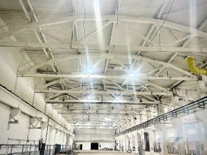 - Производственное помещение 1 размером 102,5х12м, высота до ферм 7-8м, крыша 8-9м, установлены две кран-балки г/п 5т.