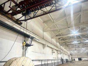 - Производственное помещение 2 размером 102,5х12м, высота до ферм 7-8м, крыша 8-9м, установлены две кран-балки г/п 5т.