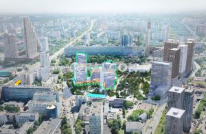 Благоустроенная озелененная площадь, связывающая офисные башни с метро