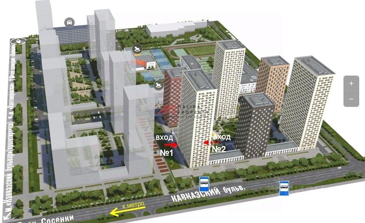 Помещение располагается в строящемся жилом комплексе "Кавказский бульвар 51". Срок заселения домов согласно сайту застройщика октябрь 2025 года. В проекте жилые дома высотой от 23 до 33 этажей, все 6 корпусов первой очереди сдаются с отделкой. 3 очереди по 2000 квартир в каждой. Всего 6000 квартир. Потенциальное кол-во жителей 9000 — 10 000 человек.