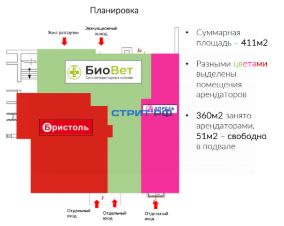 В здании находятся арендаторы: алкомаркет "Бристоль", ветеринарная клиника "Биовет", аптека "Апрель". В подвале есть свободное помещение площадью 51 м². Оно идеально подойдёт для пункта выдачи заказов (ПВЗ), кофейни или салона красоты.