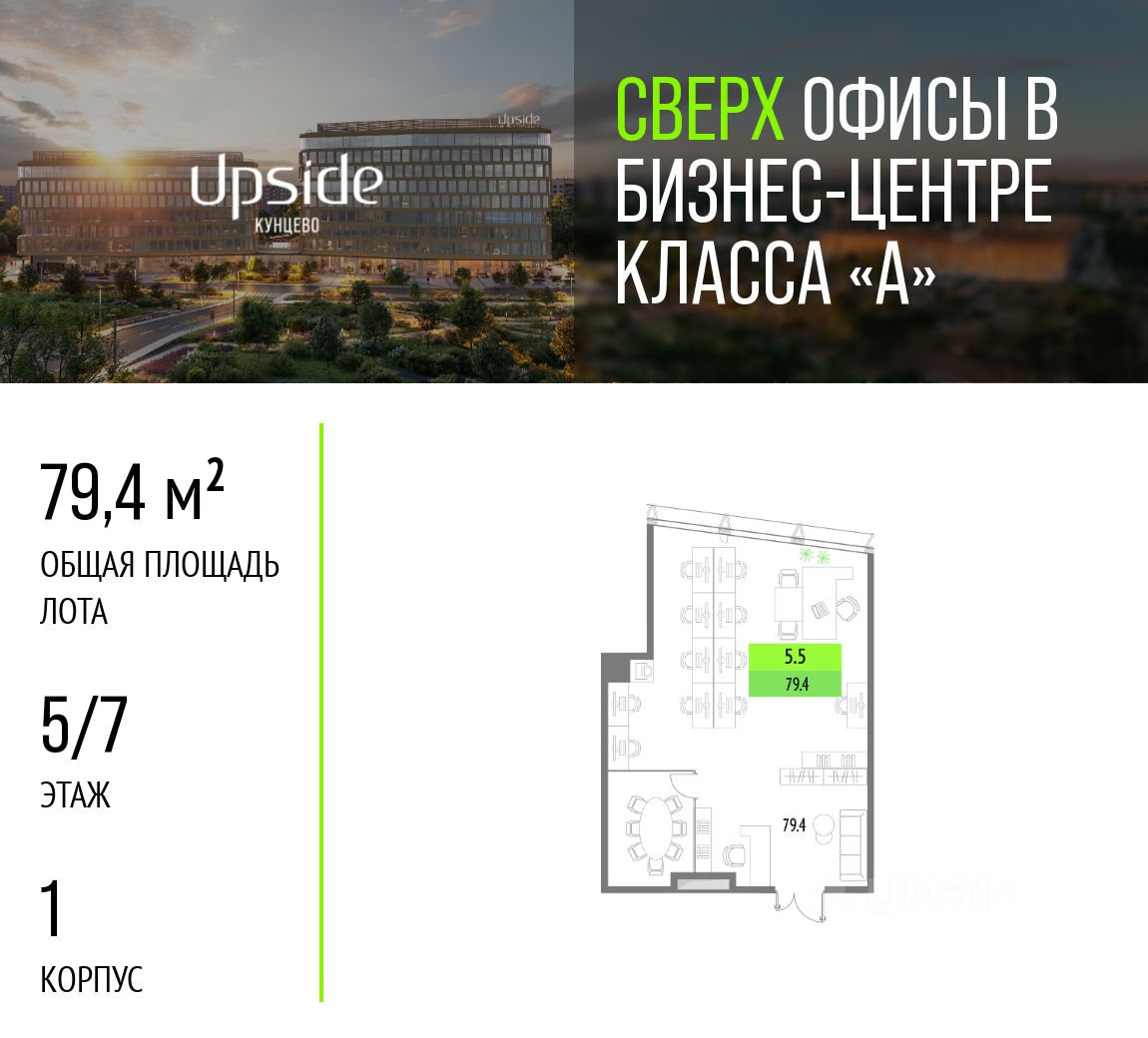 В продаже офисное помещение в строящемся бизнес-центре класса "А" Upside Кунцево. Срок ввода в эксплуатацию — IV квартал 2025 года. Рассрочка 0% от застройщика до ввода объекта в эксплуатацию, с ПВ от 50% Эко-архитектура современной урбанистики и свой природный парк Бизнес-центр состоит из двух корпусов, вписанных в природный ландшафт. Такой эффект достигается благодаря концептуальным решениям: имитации растительных форм и интеграции природных элементов в объект. Стилистика интерьера вдохновлена органической архитектурой. Образ пространства дополнят объекты современного искусства. Впечатляющая транспортная доступность Бизнес-центр Upside Кунцево находится в престижном районе на западе Москвы, в 50 метрах от трёх станций метро "Кунцевская", новой платформы БКЛ и одноимённой станции МЦД-1. Время в пути: • до съезда на Рублёвское шоссе — 1 минута, • до Кутузовского проспекта — 5 минут, • до Москва-Сити и Нового Арбата — 15 минут. Инфраструктура для продуктивной работы Внутренняя инфраструктура разнообразна и насыщена, что позволит создать комфортную среду для резидентов. Для работы предусмотрены: • переговорные комнаты, • коворкинги, • конференц-зал, • мультиформатные деловые пространства, • двухуровневый подземный паркинг. Сотрудники и гости БЦ смогут воспользоваться кафетерием с выходом на открытую террасу, где можно дистанционно заказать блюда. На первом этаже расположится коммерческая инфраструктура: продуктовый ритейл, кафе и рестораны, кулинария, аптека, салон красоты, постаматы. Высокотехнологичный бизнес-центр с современными инженерными решениями Бизнес-центр Upside Кунцево получил сертификат GREEN ZOOM за соответствие экологическим требованиям и энергосбережение. В здании используются энергоэффективное оборудование и материалы, а также системы рекуперации тепла. В бизнес-центре круглый год поддерживается комфортный микроклимат благодаря автоматизированной системе управления, приточно-вытяжной вентиляции и центральному кондиционированию. Системы безопасности и комфорта включают: • видеонаблюдение, • FACE ID, • распознавание госномеров для доступа в паркинг, • скоростные бесшумные лифты с интеллектуальным управлением, • бесплатный Wi-Fi. Девелопер проекта Upside Development.