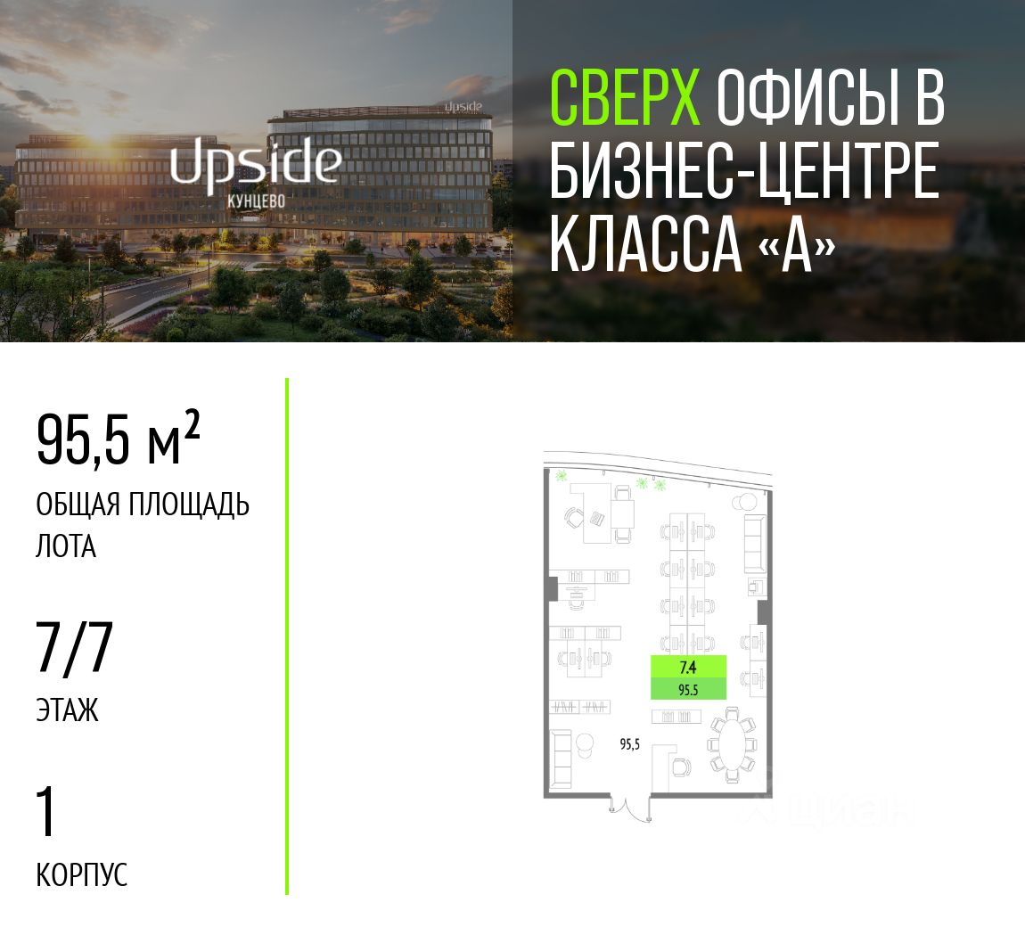В продаже офисное помещение в строящемся бизнес-центре класса "А" Upside Кунцево. Срок ввода в эксплуатацию — IV квартал 2025 года.