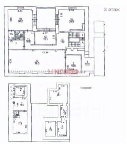 Общая площадь объекта составляет 800 кв.м, распределенная по трем этажам и подвалу: