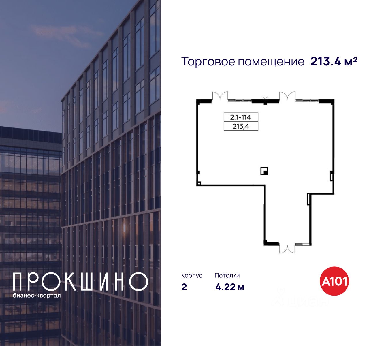 Продаётся торговое помещение площадью 213.4 кв. м. в Бизнес-квартал "Прокшино". Без отделки. Окна с видом во двор и на улицу. Высота потолков 4.22 м. Выделенная электрическая мощность — 130 кВт. Общий вход с улицы. Стоимость помещения — 119 290 600 руб. Способы оплаты и более подробная информация по телефону.