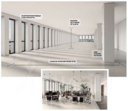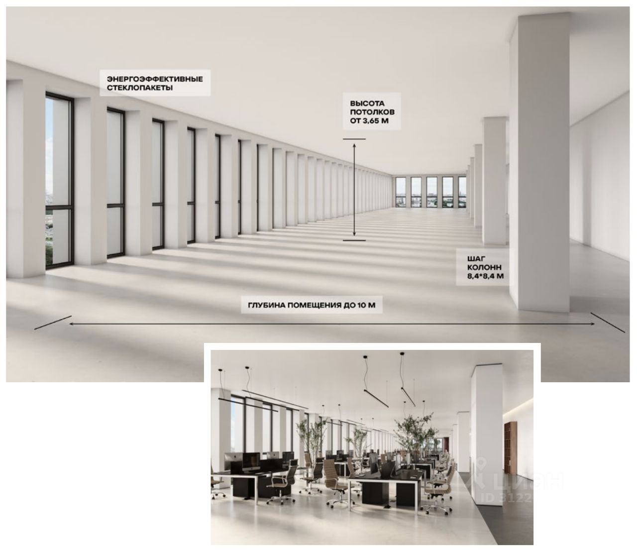 Планировки офисных этажей соответствуют требованиям функционального офиса: глубина помещений 8-10 м, высота потолков 3,65 м, шаг колонн 8,4 х 8,4 м.