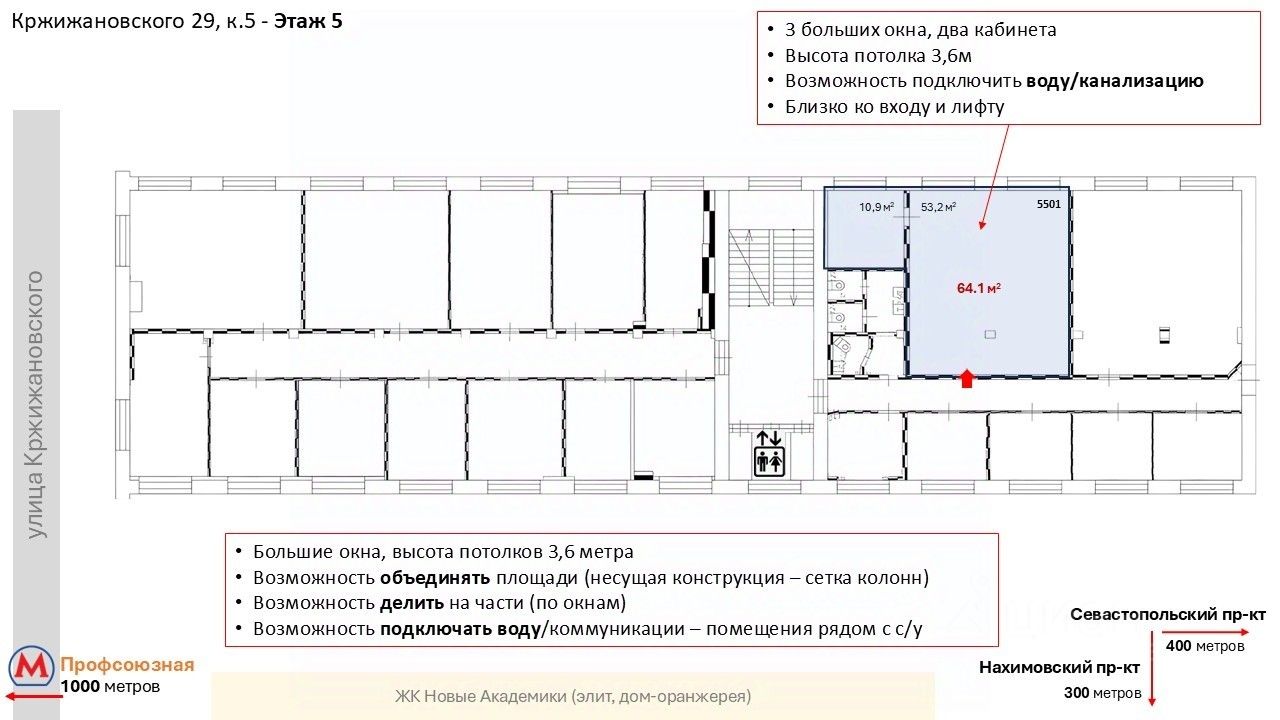 Близость к метро Профсоюзная, Академическая, Калужская - район с высокой деловой активностью.