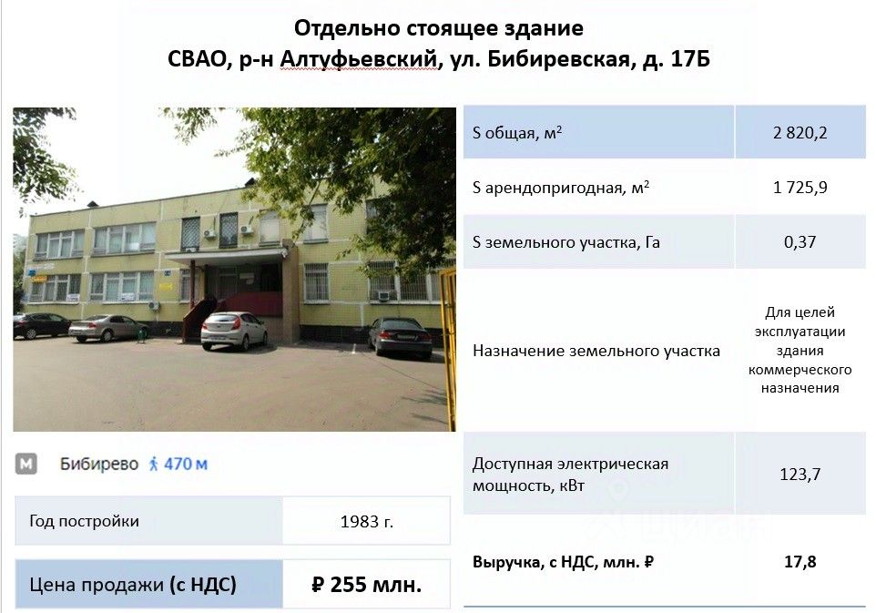 Здание расположено на собственной огороженной территории недалеко от метро Бибирево. На прилегающей территории предусмотрена парковка вмещающая 10 м/м, закрытая территория, въезд под шлагбаум. Здание обеспечено всеми необходимыми коммуникациями. Внутреннее пространство спроектировано в классическом коридорном стиле. Санузлы на каждом этаже. Оперативный показ. Подробности по телефону