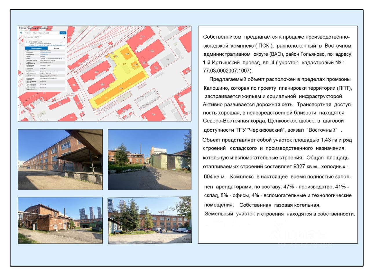 СОБСТВЕННИК предлагает к продаже имущественный производственно-складской комплекс , расположенный в ВАО, район Гольяново, по адресу: 1-й Иртышский проезд, владение 4, кадастровый номер земельного участка 77:03:0002007.