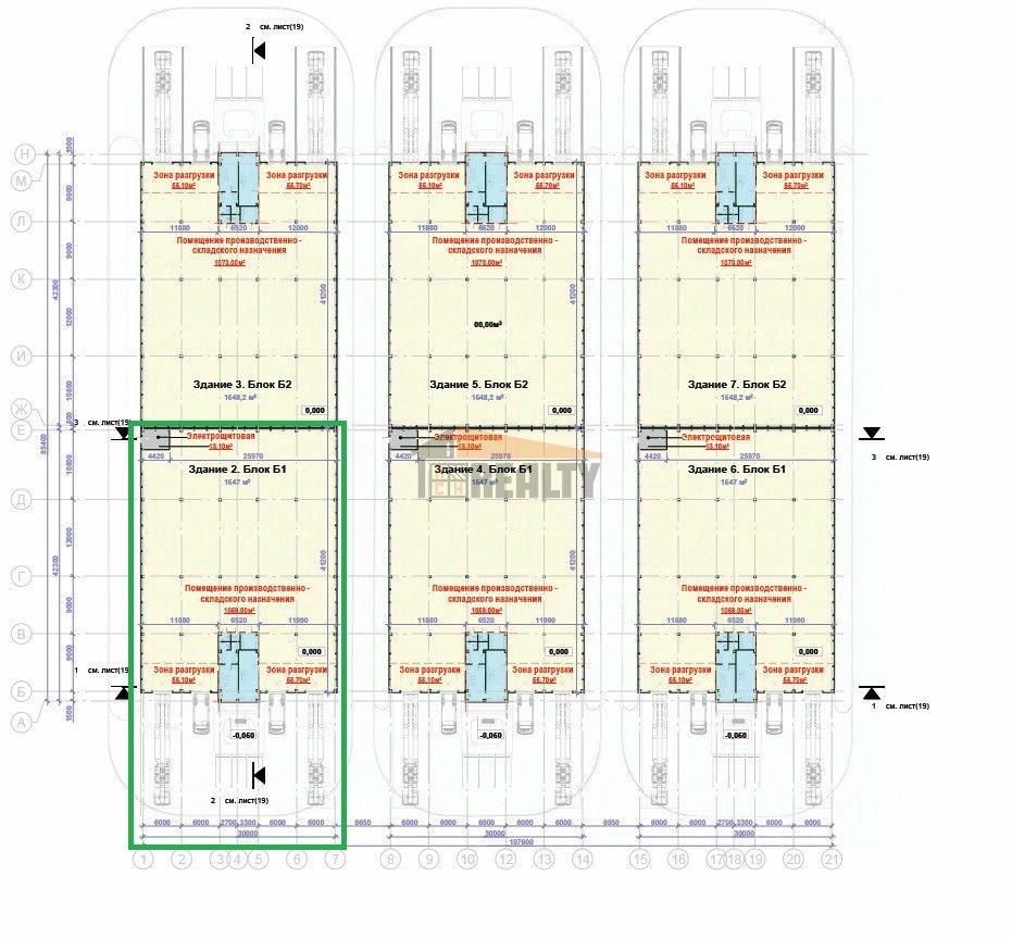 Комплекс представлен в виде 8-ми одноэтажных зданий с антресольным этажом на отметке +4,5м. Площадь производственно-складских помещений варьируется от 656,31 м2 до 2681 м2. В состав блока входят: зона разгрузки, помещение производственно-складского назначения, пространство антресоли для хранения тары; мест общего пользования (лестница, комната отдыха персонала, раздевалка, гардеробные, душевые, технические помещения).