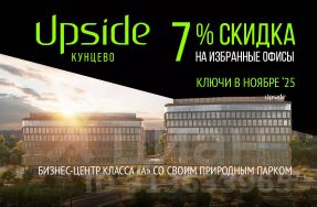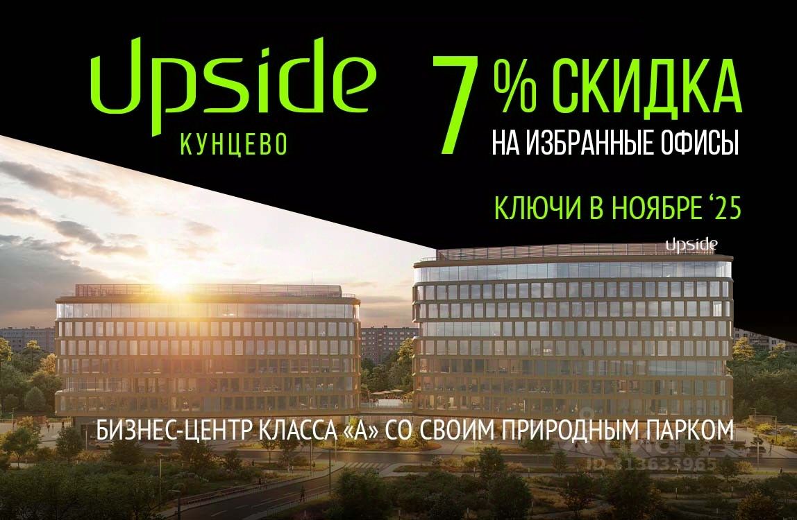 В продаже офисное помещение в строящемся бизнес-центре класса "А" Upside Кунцево. Ключи в ноябре 2025 года. На сегодняшний день бизнес-центр распродан более чем на 70%, но в наличии есть имиджевые офисы нового поколения от 79 м² до возможности приобрести целый этаж. До 31.10.2025 года действует скидка 7% на избранные офисы. Рассрочка от застройщика, ПВ 30% Эко-архитектура современной урбанистики и свой природный парк Бизнес-центр состоит из двух корпусов, вписанных в природный ландшафт. Такой эффект достигается благодаря концептуальным решениям: имитации растительных форм и интеграции природных элементов в объект. Стилистика интерьера вдохновлена органической архитектурой. Образ пространства дополнят объекты современного искусства. Впечатляющая транспортная доступность Бизнес-центр Upside Кунцево находится в престижном районе на западе Москвы, в 50 метрах от трёх станций метро "Кунцевская", новой платформы БКЛ и одноимённой станции МЦД-1. Время в пути: • до съезда на Рублёвское шоссе — 1 минута, • до Кутузовского проспекта — 5 минут, • до Москва-Сити и Нового Арбата — 15 минут. Инфраструктура для продуктивной работы Внутренняя инфраструктура разнообразна и насыщена, что позволит создать комфортную среду для резидентов. Для работы предусмотрены: • переговорные комнаты, • коворкинги, • конференц-зал, • мультиформатные деловые пространства, • двухуровневый подземный паркинг. Сотрудники и гости БЦ смогут воспользоваться кафетерием с выходом на открытую террасу, где можно дистанционно заказать блюда. На первом этаже расположится коммерческая инфраструктура: продуктовый ритейл, кафе и рестораны, кулинария, аптека, салон красоты, постаматы. Высокотехнологичный бизнес-центр с современными инженерными решениями Бизнес-центр Upside Кунцево получил сертификат GREEN ZOOM за соответствие экологическим требованиям и энергосбережение. В здании используются энергоэффективное оборудование и материалы, а также системы рекуперации тепла. В бизнес-центре круглый год поддерживается комфортный микроклимат благодаря автоматизированной системе управления, приточно-вытяжной вентиляции и центральному кондиционированию. Системы безопасности и комфорта включают: • видеонаблюдение, • FACE ID, • распознавание госномеров для доступа в паркинг, • скоростные бесшумные лифты с интеллектуальным управлением, • бесплатный Wi-Fi. Девелопер проекта Upside Development.