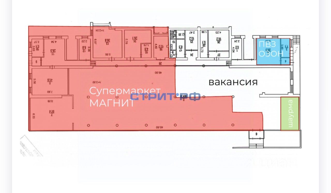 Арендаторы: Магнит, Ozon, Шаурма, вакантная площадь 360 м2