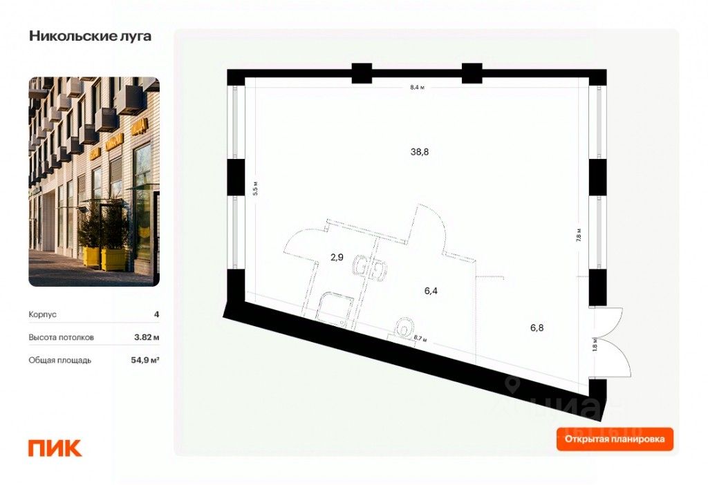 - Открытая планировка, возможно объединить несколько помещений