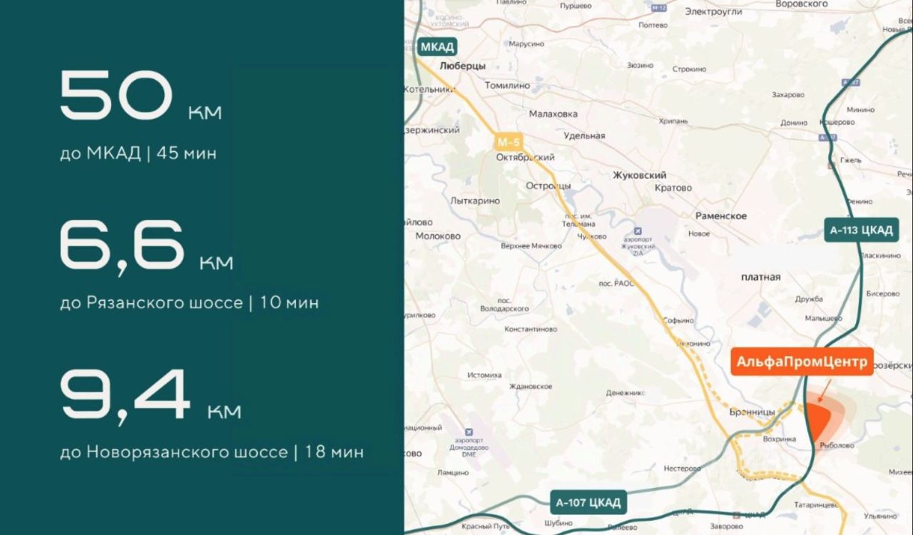 Оптимальная локация для логистики и производства рядом ЦКАД и ключевые трассы, что снижает транспортные издержки.
