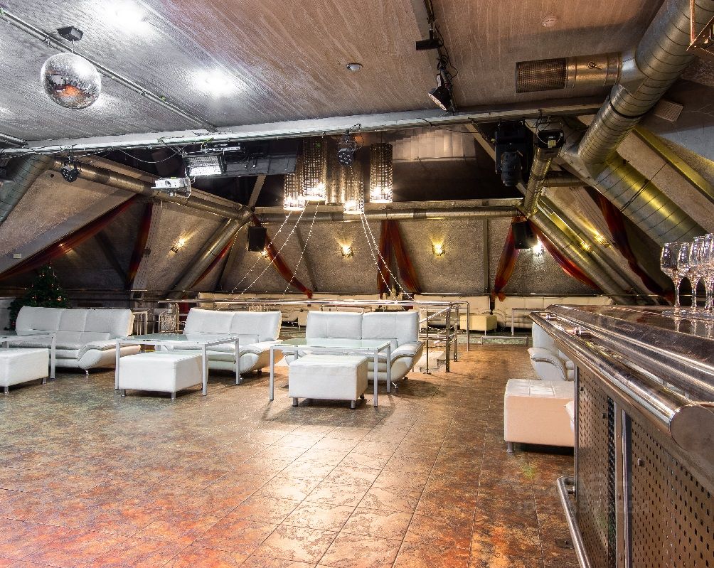 Сейчас - ночной клуб, поэтому окна сознательно задрапированы. Конструкция здания позволяет легко изменить планировку помещения.