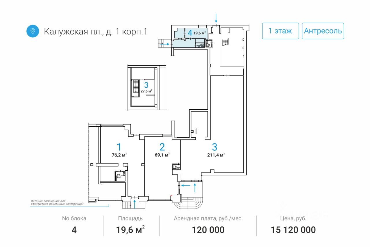 К продаже предлагается торговое помещение площадью 19.6м² по адресу: Москва, Калужская пл. д.1 корп.1
