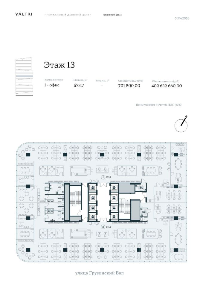 Премиальный деловой центр VАLTRI. Проект класса ПРАЙМ общей площадью 35,2 тыс. кв. м будет построен по адресу: г. Москва, ЦАО, Пресненский р-н, ул. Грузинский Вал,3. Общее количество этажей 27, из которых три этажа подземного паркинга. Высота здания составит 99.9 метров.