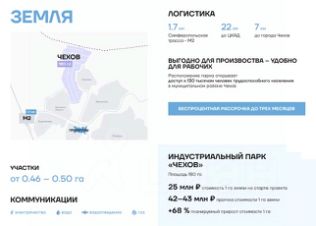 Документы на участок предоставляются по запросу. При необходимости подберем альтернативные участки в данной локации. Площадь доступных участков — от 0,4 до 50 га. Общая площадь парка Чехов: 180 га.