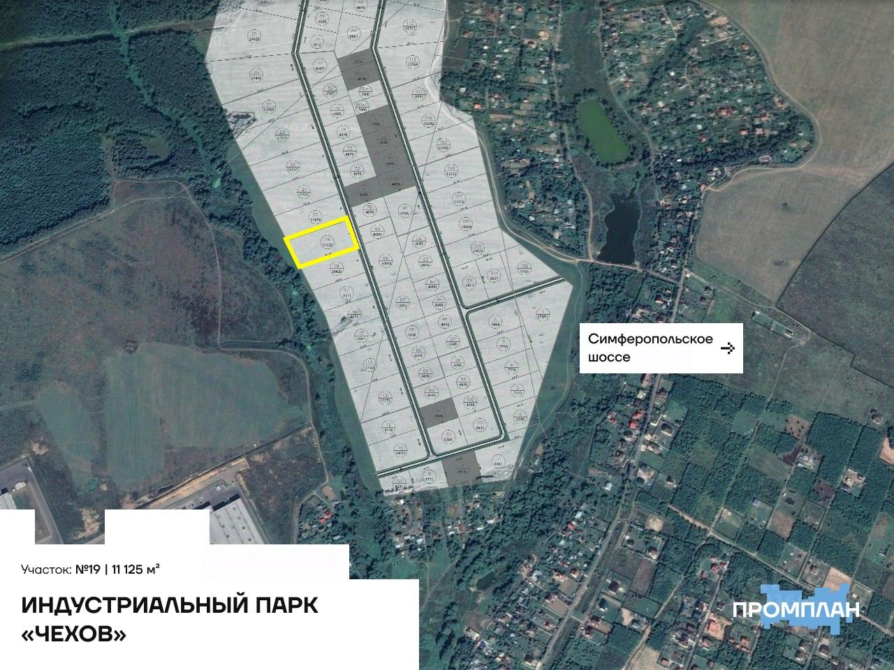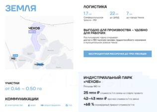 Документы на участок предоставляются по запросу. При необходимости подберем альтернативные участки в данной локации. Площадь доступных участков — от 0,4 до 50 га. Общая площадь парка Чехов: 180 га.