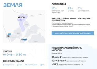 Документы на участок предоставляются по запросу. При необходимости подберем альтернативные участки в данной локации. Площадь доступных участков — от 0,4 до 50 га. Общая площадь парка Чехов: 180 га.