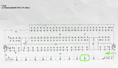 Место находится слева при въезде в паркинг, сразу за помещением охраны и имеет площадь 22 кв.м., что значительно больше чем большинство машинно-мест в этом паркинге, имеющих в среднем 15-16 кв.м., и позволит поставит большой автомобиль или авто с прицепом.