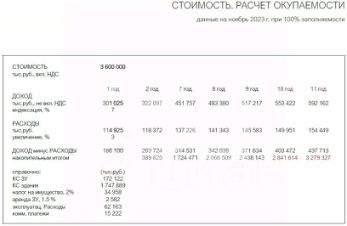 707692 . Торгово-офисный центр на Снежной улице. 2 минуты пешком от станции метро Свиблово. Плотный жилой массив. Интенсивный автомобильный и пешеходный трафик. Посещаемость торгового центра: более 4 000 человек. -1, 2, 4 этажи 14-этажного ТОЦ. 6 входных групп. Места для вывесок. Зона разгрузки/погрузки. Вытяжки для общепита. 3 подземных этажа (паркинг) на 250 гостевых машиномест. Возможность организации летней веранды. Электрическая мощность: 1 610 кВт. Высота потолков: 3.5 м. Арендаторы: Перекрёсток, Детский мир, DNS, Теремок, ВТБ. Общий МАП: 30 102 500 руб. Окупаемость: 10 лет.