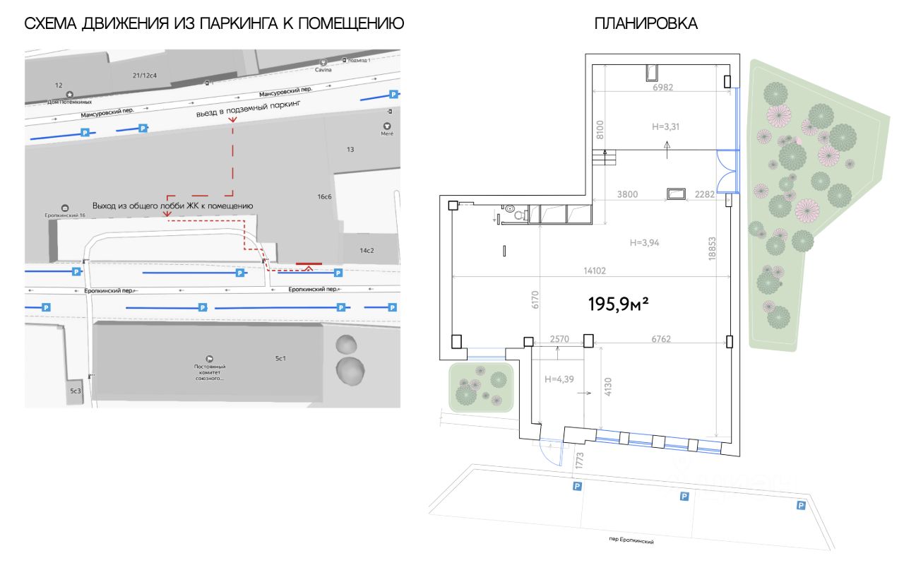 перед помещением, как и на протяжении всего Еропкинского и близлежащих переулков, предусмотрена городская парковка, а для удобства будущего владельца в собственности есть 2 просторных машино-места в подземном паркинге ЖК